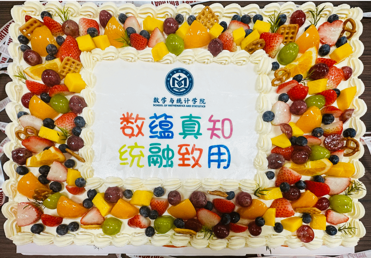 在温馨热烈的氛围中,全体教职工和寿星们一起,共同分享生日蛋糕。蛋糕上“数蕴真知 统融致用”的院训十分醒目,催人奋进。