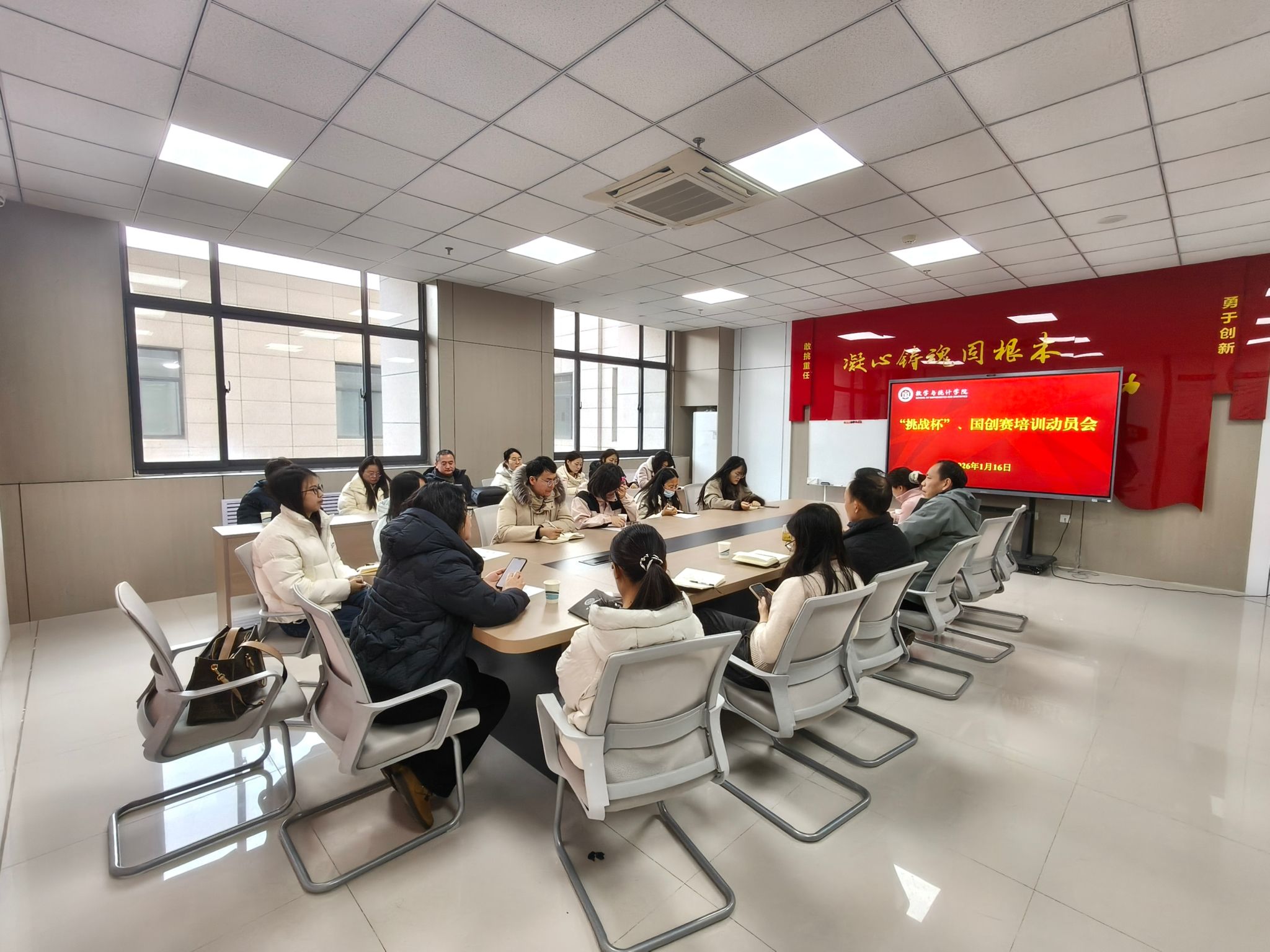 为深入贯彻落实立德树人根本任务,强化学生创新实践能力培养,凝聚学科师资力量备战各类创新创业赛事,1月16日上午,数学与统计学院于惟德楼317-2党员之家召开“挑战杯”“国创赛”动员培训会。学院党委副书记程凯、团委书记刘姗、24年和25年新进博士、统计教研室教师参加会议,会议由团委书记主持。