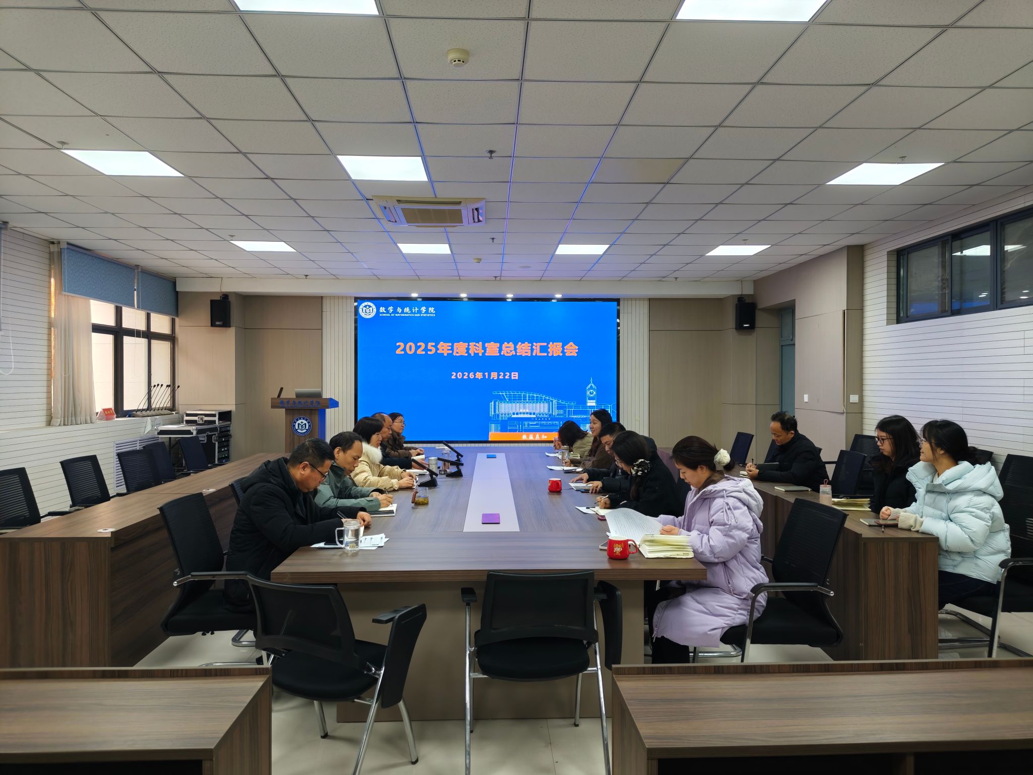 为系统总结学院过去一年各科室工作成效,深入分析存在的问题与不足,科学谋划2026年度工作,1 月 23 日下午,数学与统计学院在惟德楼315会议室召开2025年度科室工作总结汇报会。学院领导班子全体成员、全体行政坐班人员参加会议。会议由院党委书记郭红彦主持。