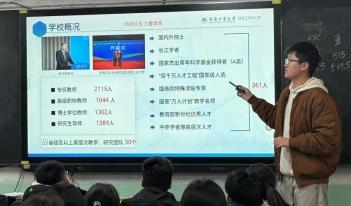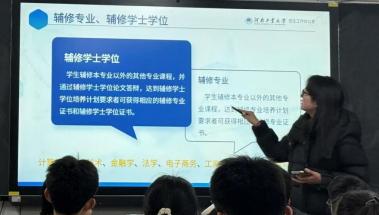 与此同时,高三五班的分享现场气氛热烈而有序。刘依萌同学没有采用传统的 PPT 念读形式,而是以“大学版升级指南”为框架,系统且生动地讲解了大学 阶段的多项关键政策。她围绕学校基本情况、转专业、资助政策、辅修学士学 位与微专业展开分享,不仅详细解读了河南工业大学的基本情况和国家奖学金、助学金等资助体系,还清晰梳理了转专业的相关问题,以及辅修微专业的 培养路径与发展价值。让台下同学对大学学业规划有了更清晰的认知,有效缓 解了大家对未来的迷茫感,也为同学们提前规划大学生活提供了切实的参考。