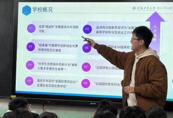 757 组的朱彦全同学的宣讲从一帧帧校园风景开始——莲湖倒映的图书馆、梧 桐树下的林荫大道、操场上飞扬的社团旗帜…这些鲜活的画面,让河南工业大 学不再是遥远的校名,而是触手可及的青春图景。朱彦全同学从学校历史沿革、学科建设、师资力量、科研成果等方面,详细介绍了河南工业大学作为省 属重点高校的办学优势。重点展示了我校在粮食工程、机械工程等特色领域的 领先地位,以及“厚基础、重实践、强能力 ”的人才培养模式,帮助学生明确 专业发展方向。不仅介绍了学校的学科优势,还讲了应用统计学相关发展前景 以及广泛应用价值。