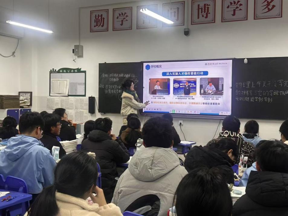 宣讲现场氛围热烈而有序,同学们满怀期待、专注聆听。活动伊始,陈慧娟同学播放了河南工业大学招生宣传片,镜头中错落有致的校园建筑、浓厚醇厚的学术氛围、丰富多彩的校园活动以及朝气蓬勃的学子风貌,瞬间吸引了在场学子的目光,让大家对工大的校园生活心生向往,也为整场宣讲活动拉开了精彩序幕。