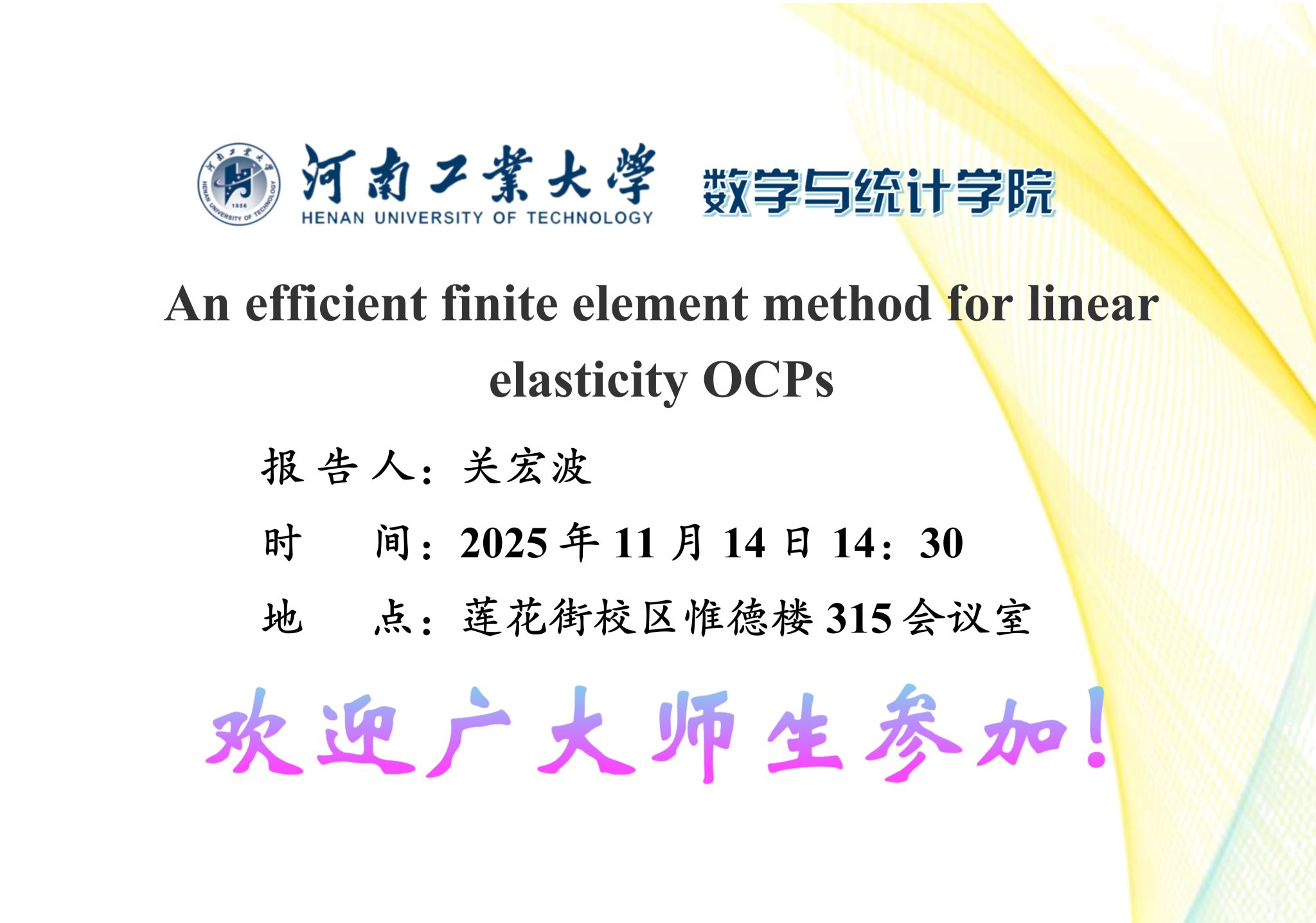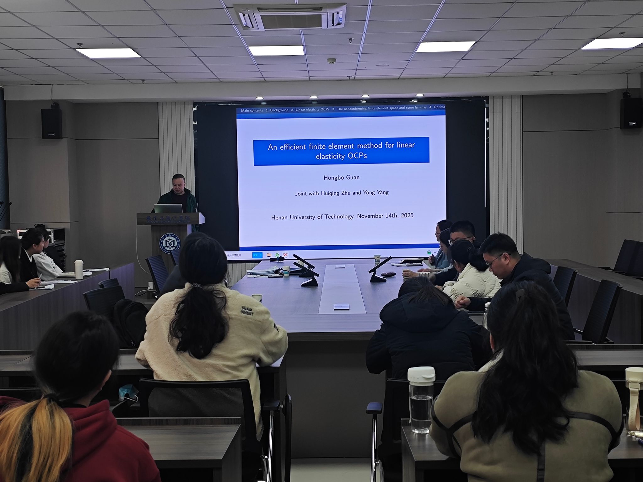 郑州轻工业大学关宏波教授应邀来数学与统计学院作学术报告11月14日下午,应数学与统计学院邀请,郑州轻工业大学数学与信息科学学院关宏波教授在莲花街校区惟德楼315会议室作了题为“An efficient finite element ...