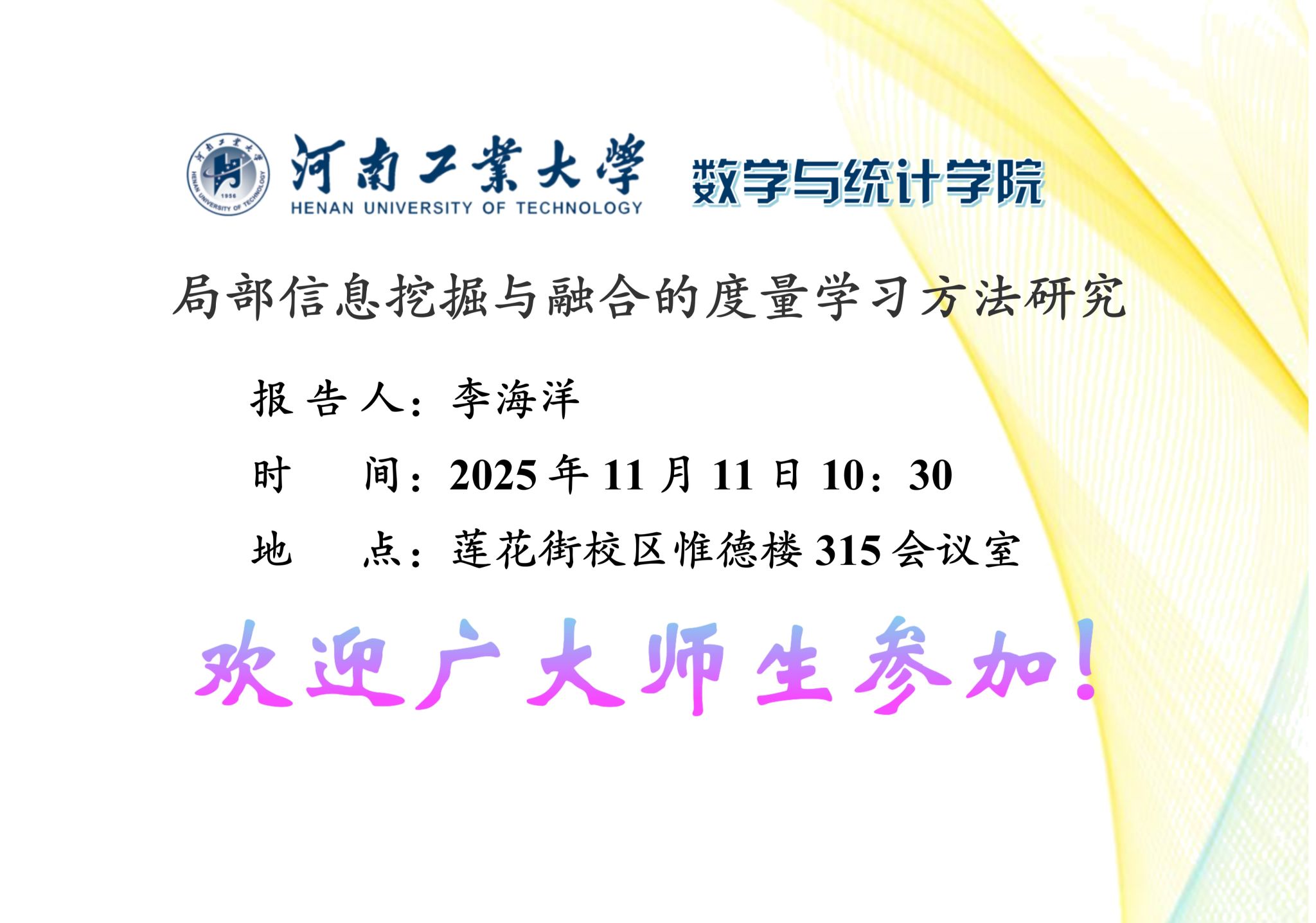 广州大学博士生导师李海洋教授来数学与统计学院作学术报告11月11日,应数学与统计学院邀请,广州大学博士生导师李海洋教授在惟德楼315会议室作了题为“局部信息挖掘与融合的度量学习方法研究”的学术报告。院长谷...